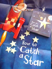 サイズは256x 246x 52ミリ 星を探しに行くグッズ(小さな懐中電灯、光る星、ポスター)とミニ絵本のセット