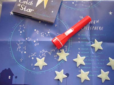 ポスターと壁に貼り付ける星シール、それを照らすミニ懐中電灯、ミニ絵本のセットです。 ポスター裏には星座マップ