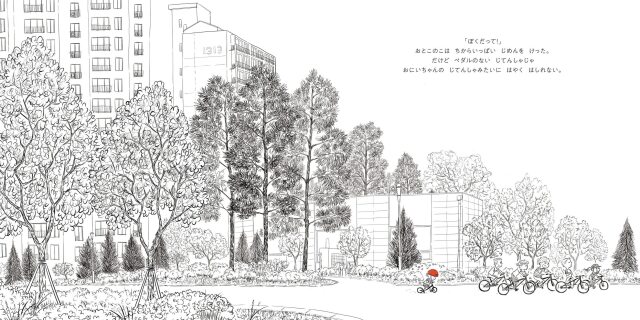 ペダルなしの幼児用自転車にのる少年は、二輪自転車をこぐお兄ちゃんについていこうとしますが、スピードがでません。お兄ちゃんは必死に付いてくる弟のことが気にかかりますが、結局、弟を引き離して友達と行ってしまいました。置いてきぼりにされ、来た道を戻る少年。そんな中、道で出会ったカタツムリが少年を思いがけない場所へ導いてくれて・・・。繊細な観察力と新鮮な構図で、子供の日常の中できらめく瞬間を描き出した絵本!