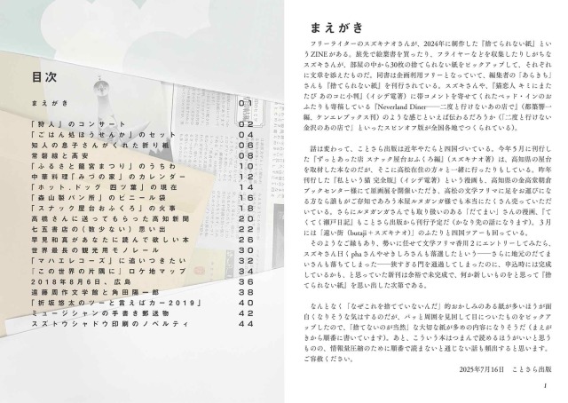 フリーライターのスズキナオさんが、2024年に制作した『捨てられない紙』というZINEがある。 旅先で絵葉書を買ったり、フライヤーなどを収集したりしがちなスズキさんが、部屋の中から30枚の捨てられない紙をピックアップして、それぞれに文章を添えたものだ。同書は企画利用フリー。 本誌『捨てられない紙』は、スズキナオさんが作った同名ZINEの、ことさら出版によるスピンオフ同人誌です。